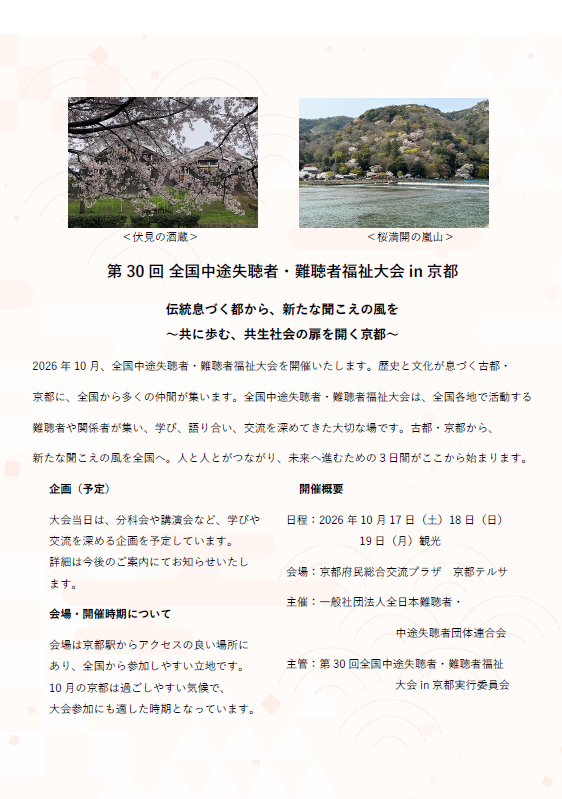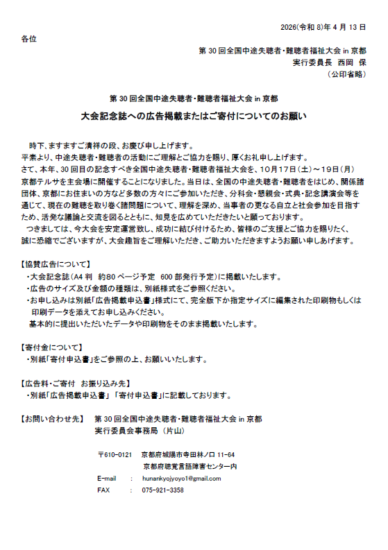今年度10月に開催されます 第30回全国中途失聴者・難聴者福祉大会 in 京都 の記念誌へのご寄付と広告募集のお願いを出しました。