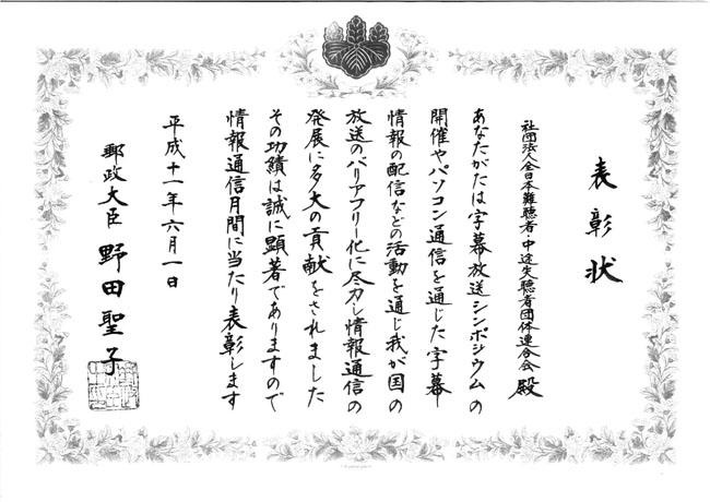 ●1999年(平成11年)6月1日 郵政省(当時)より放送のバリアフリー化に貢献した功績で郵政大臣賞を受賞
